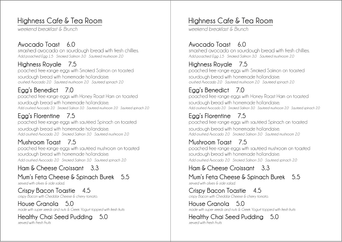 Welcome to Highness Cafe & Tea Room, a culinary gem nestled in the heart of London at 21a Highbury Park. This charming cafe offers a diverse menu that perfectly marries comfort and elegance. Ideal for breakfast, lunch, or a delightful afternoon tea, the menu features scrumptious options such as the Highness Royale, savory Mum's Famous Burek, and an array of wholesome sandwiches on focaccia.